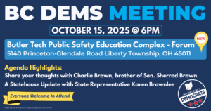 Join the Butler County Democratic Party for the Countywide Party meeting on October 15. The agenda will feature a 2025 GOTV update & presentations by 2 guest speakers. We’ll hear from Senator Sherrod Brown’s brother Charlie Brown and have the chance to offer feedback about the last campaign and thoughts for 2026, and we’ll also hear an update on everything happening at the Ohio Statehouse from State Rep. Karen Brownlee.